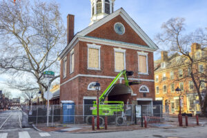 The renovation project is underway at Head House! Wood windows have been removed for repair, with plywood installed for temporary protection. First floor interior work is also in progress.